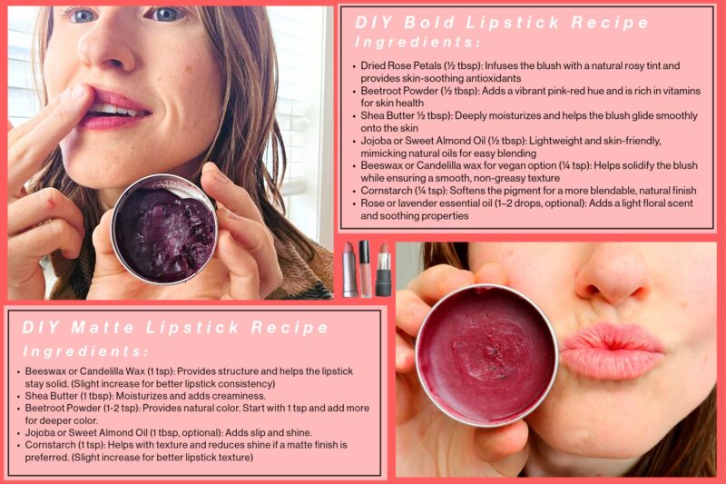 So whether you’re looking to cut down on chemicals, save a little money, or just try something fun and creative, these recipes check all the boxes. Let’s make some lipstick, friend.