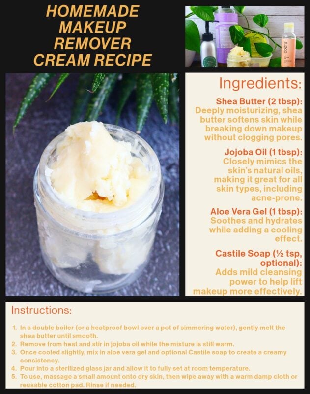 If you prefer a creamy, ultra-moisturizing way to remove makeup, this DIY makeup remover cream may be preferable to you. Unlike homemade makeup remover for oily skin, this rich and nourishing formula provides longer-lasting hydrating and protection of your skin barrier.