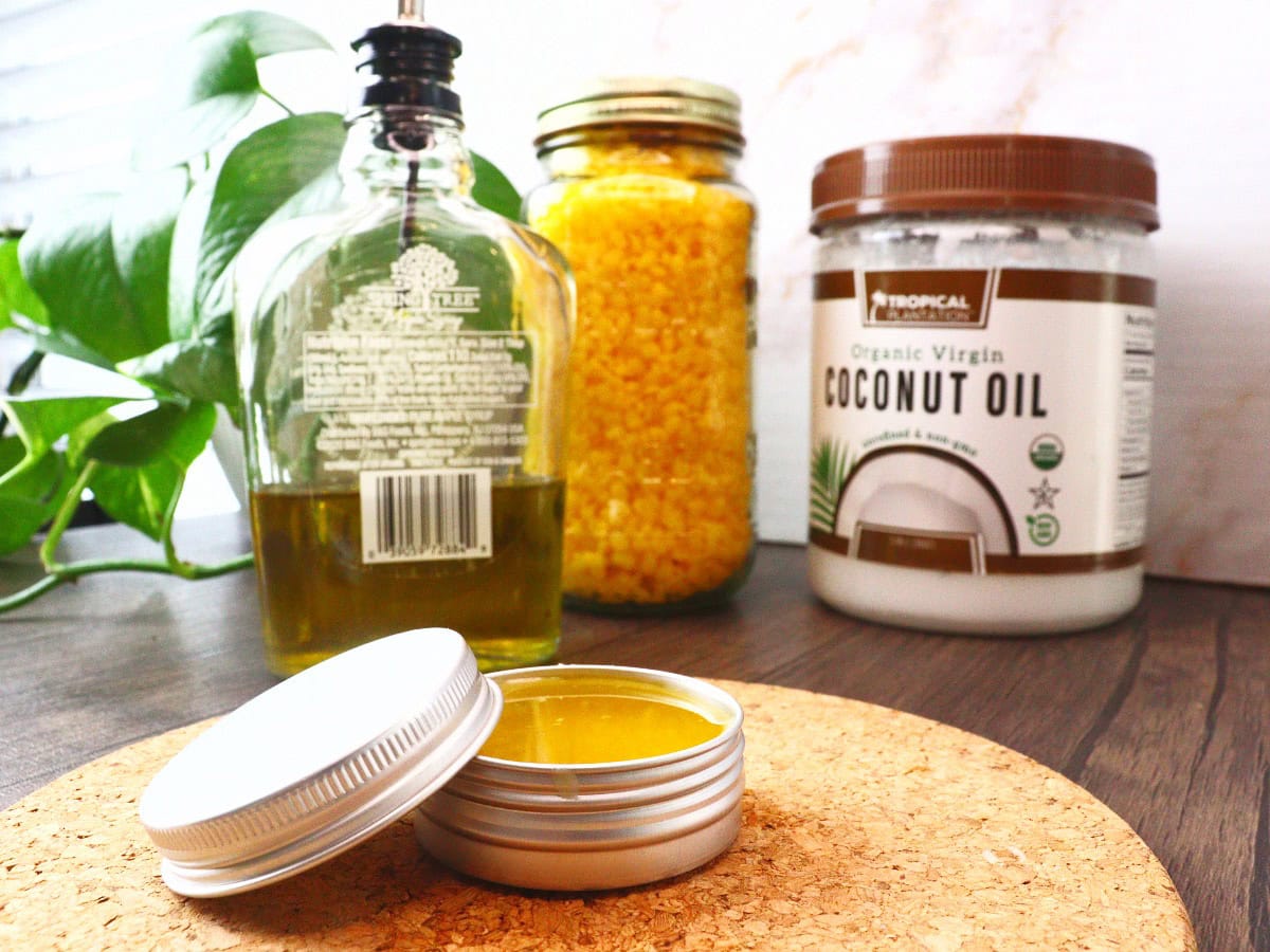 Our tried and tested recipe uses just a few ingredients, all of which have been specifically selected for their rich moisturizing and healing properties. The blend of beeswax, coconut oil, and olive oil creates a thick, creamy balm that you can use on dry spots, lips, knees, elbows, cracked heels, as a natural first aid balm, to remove makeup and even as a natural cuticle cream.