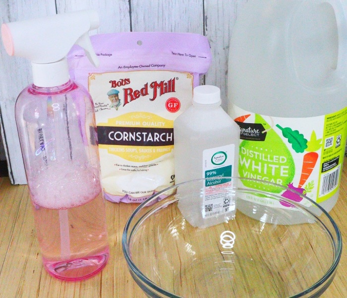 - Pour the water, white vinegar, and rubbing alcohol into a clean spray bottle.